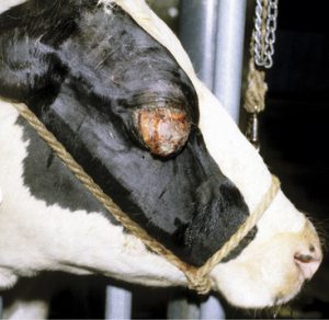 این بیماری گاوهای نر، ماده و بخصوص گاوهای جوان را تهدید می کند. عوامل محیطی چون گرد و غبار و باد و مگس ها و تغذیه نامناسب باعث ایجاد بیماری می شود.
